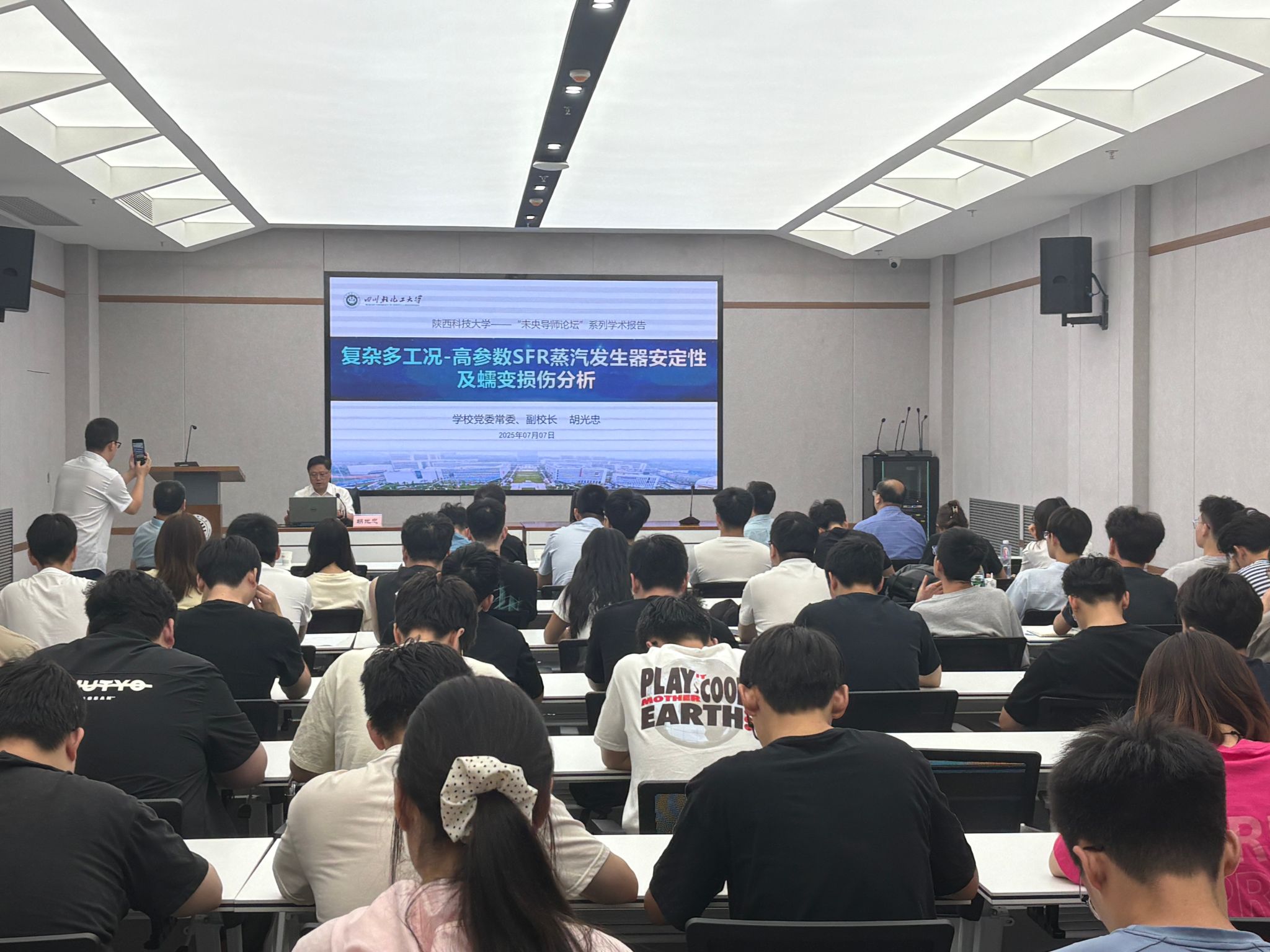 7月7日,應研究生院和機電工程學院(智能制造與機器人工程學院)邀請,四川輕化工大學副校長胡光忠教授做客我?!拔囱雽熣搲?,作了題為“復雜多工況-高參數SFR蒸汽發(fā)生器安定性及蠕變損傷分析”的學術報告,報告會由研究生院院長強濤濤教授主持,機電學院院長楊立軍、副院長袁越錦及學院相關專業(yè)教師和研究生參加了本次報告會。